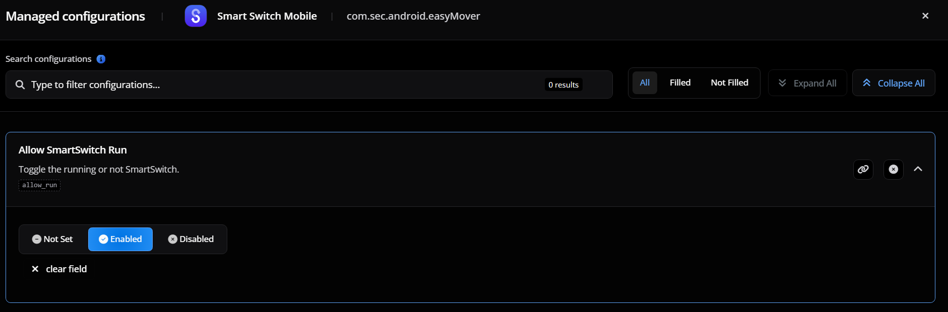 In the Nomid MDM console, navigate to the policy applied to the device and authorize the SmartSwitch app (com.sec.android.easyMover) to run in a managed environment.
