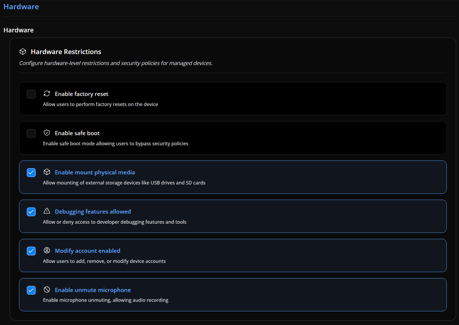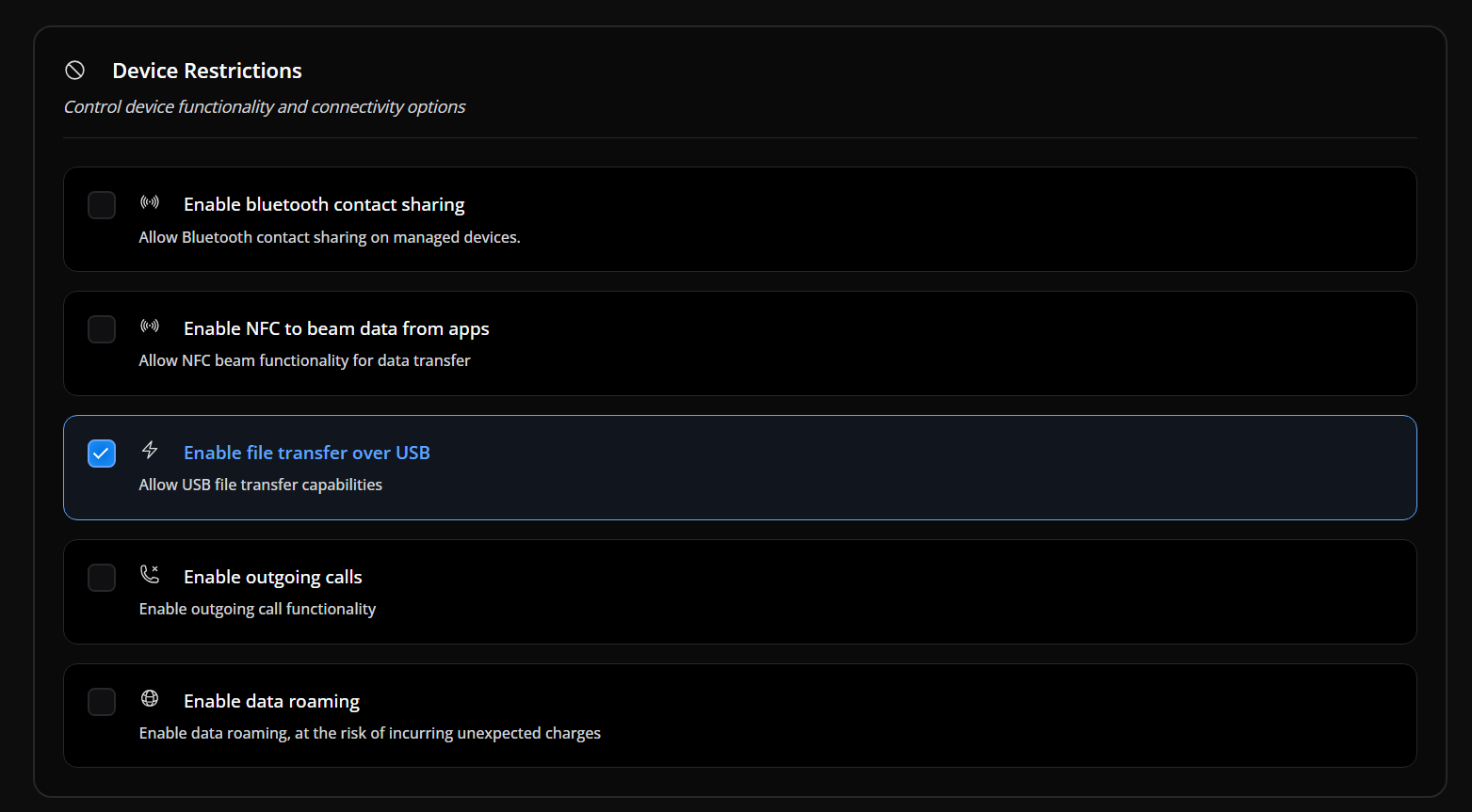 On the target device, you must enable three specific permissions in the Nomid MDM console so that SmartSwitch can properly recognize and interact with external media (USB drive/storage):